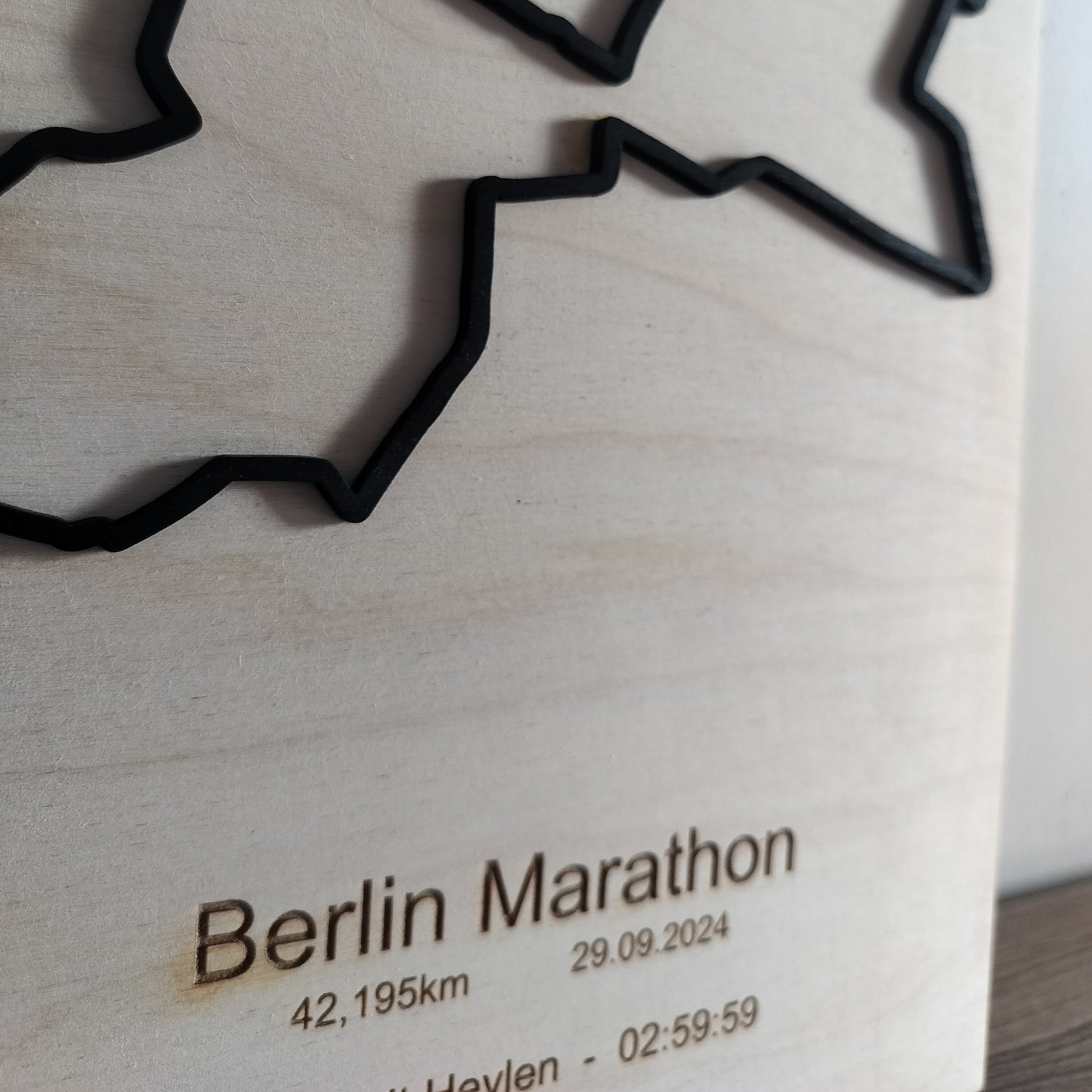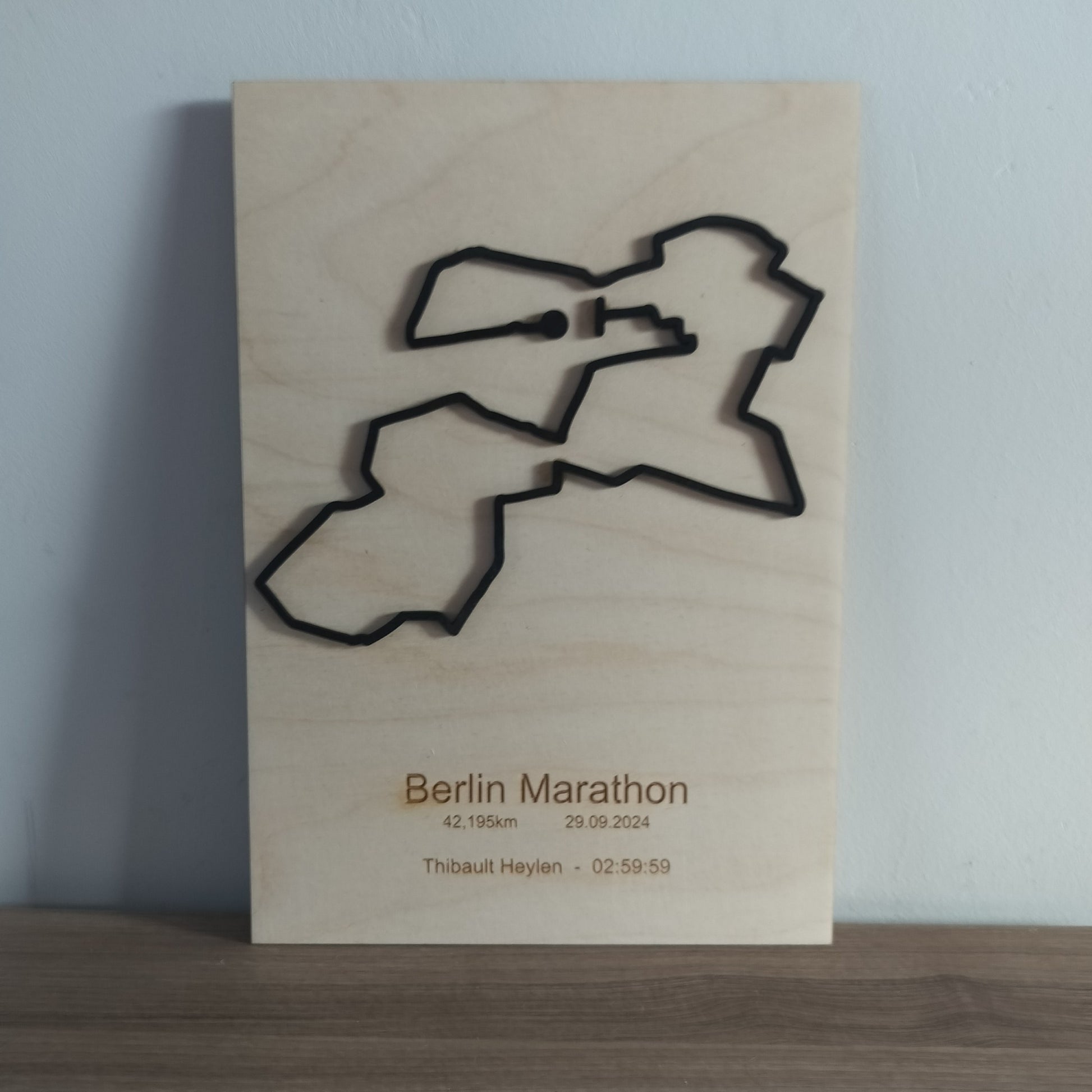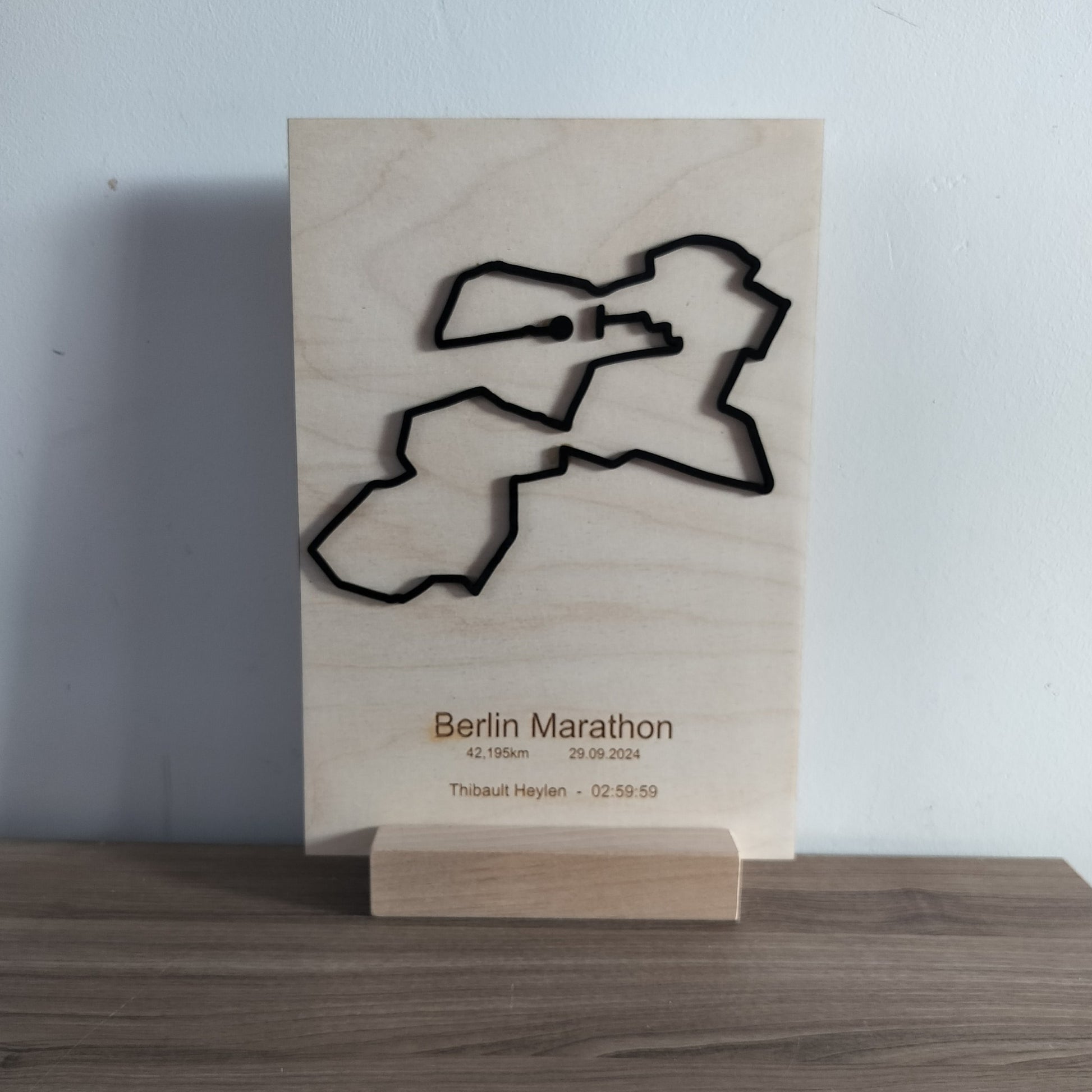Celebrate your finish line with the Route Map, a minimalist artwork that blends clean design and personal pride. Cut from 3mm birch wood, it features a black-painted top layer tracing the precise route of your run, ride, or marathon. Below, engraved details include the event name, distance, date, and your name + finish time.