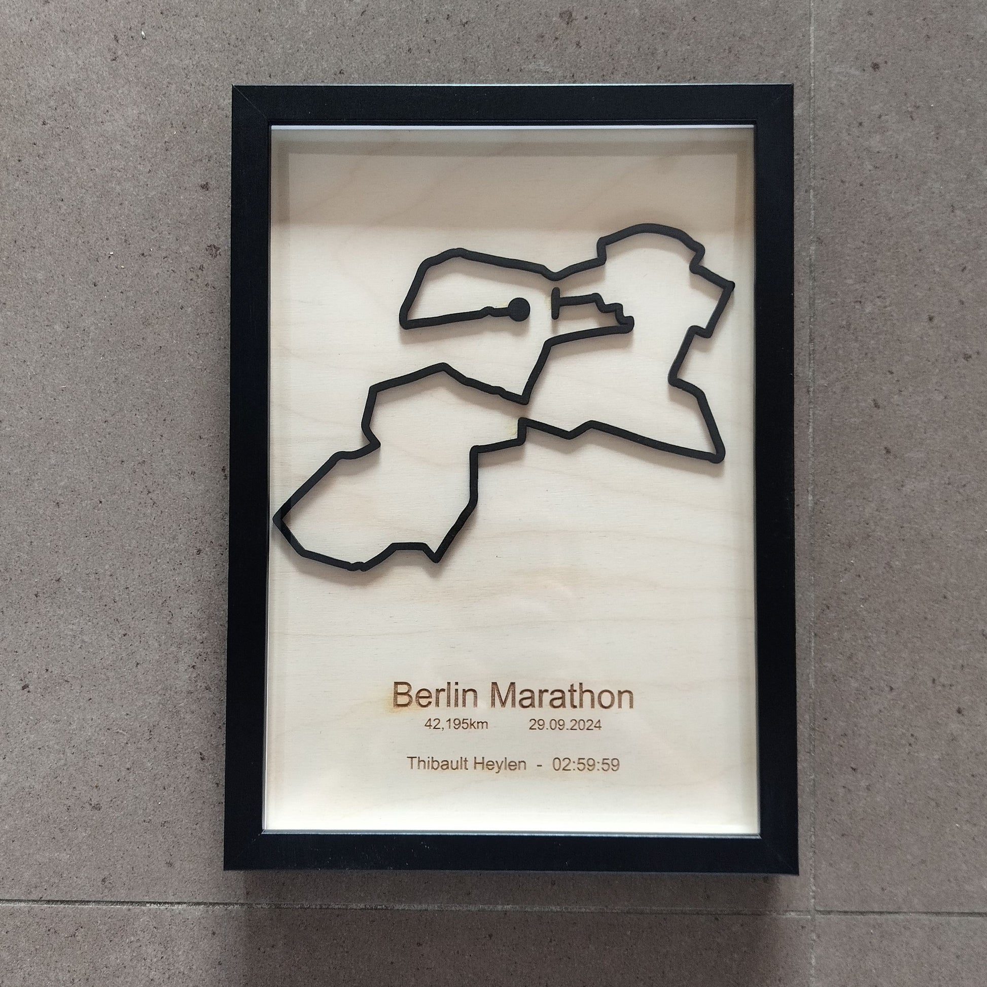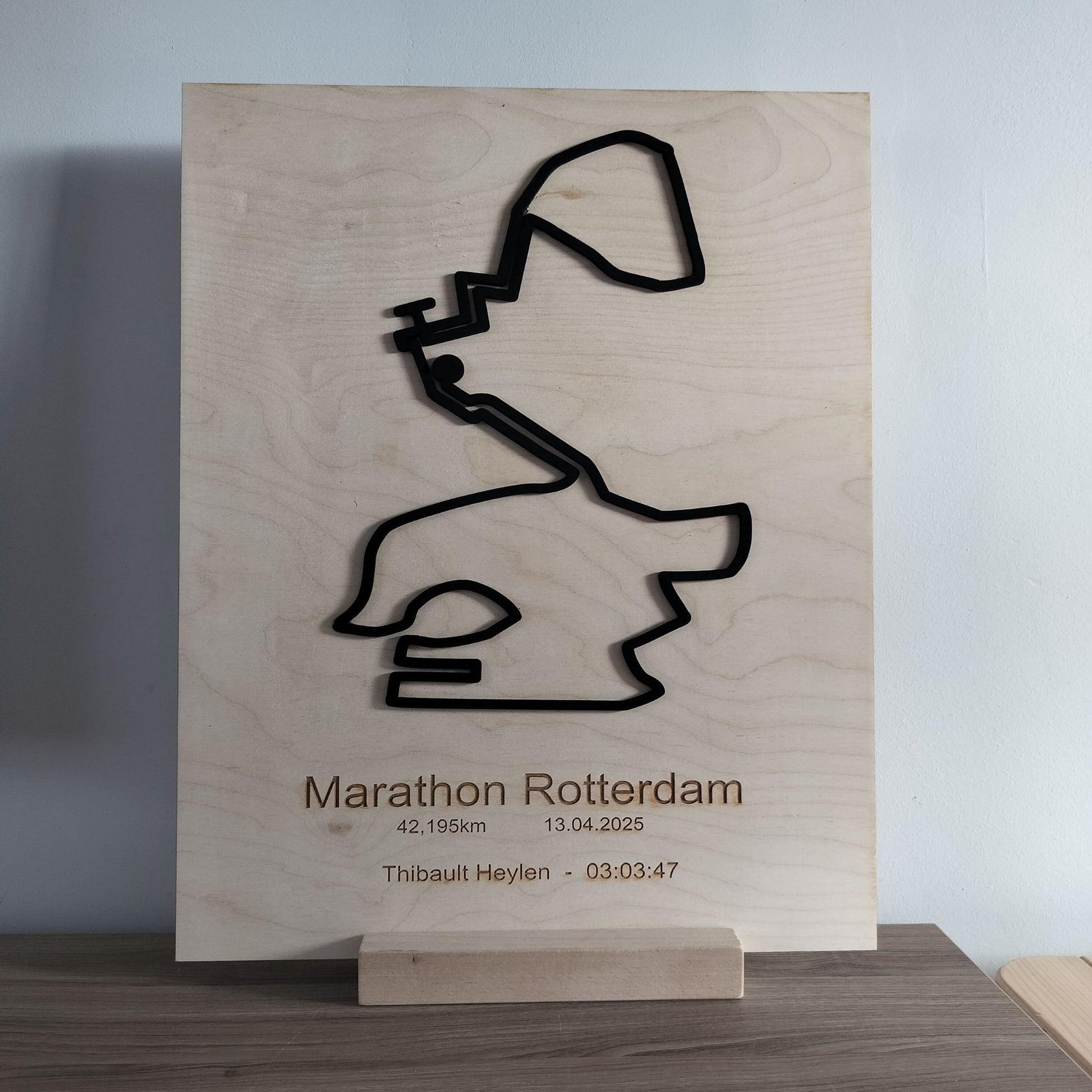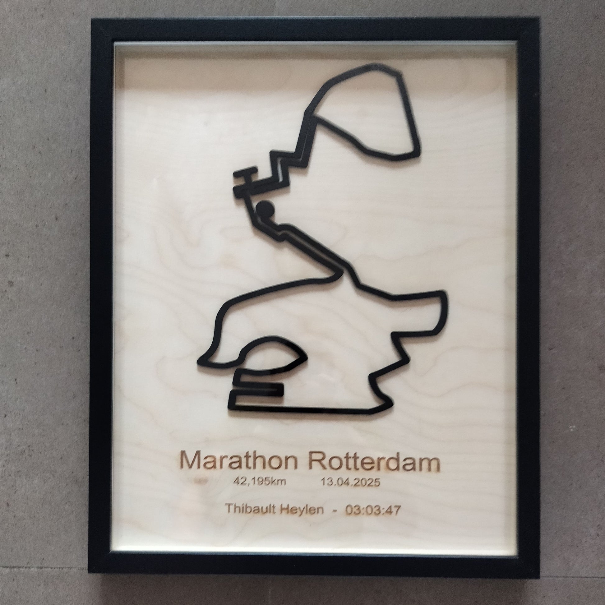 Celebrate your finish line with the Route Map, a minimalist artwork that blends clean design and personal pride. Cut from 3mm birch wood, it features a black-painted top layer tracing the precise route of your run, ride, or marathon. Below, engraved details include the event name, distance, date, and your name + finish time.